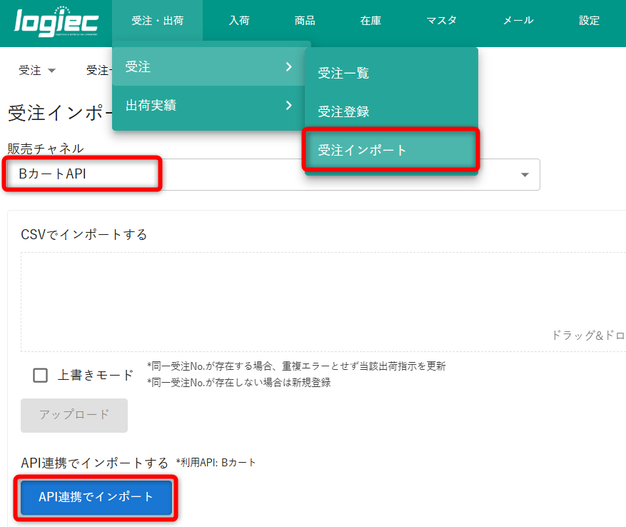 販売チャネル「BカートAPI」を選択したのち、「API連携でインポート」ボタンを押下