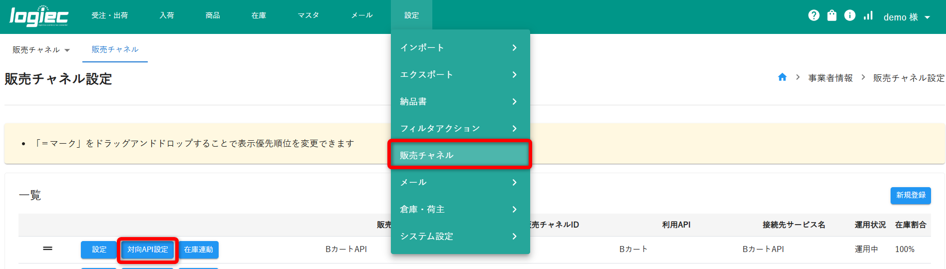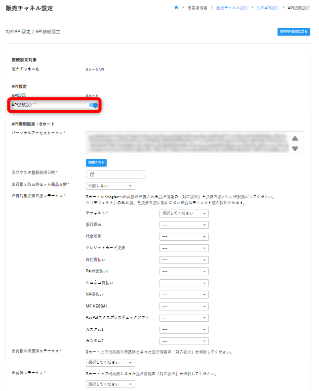 ①logiec側にログインし「設定」→「販売チャネル」→「対向API設定」→「API接続設定」に進みます。
