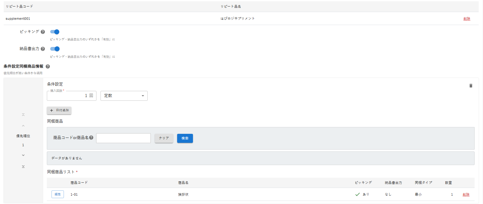 例)はぴロジサプリメント(商品コード:supplement001)を購入の方に