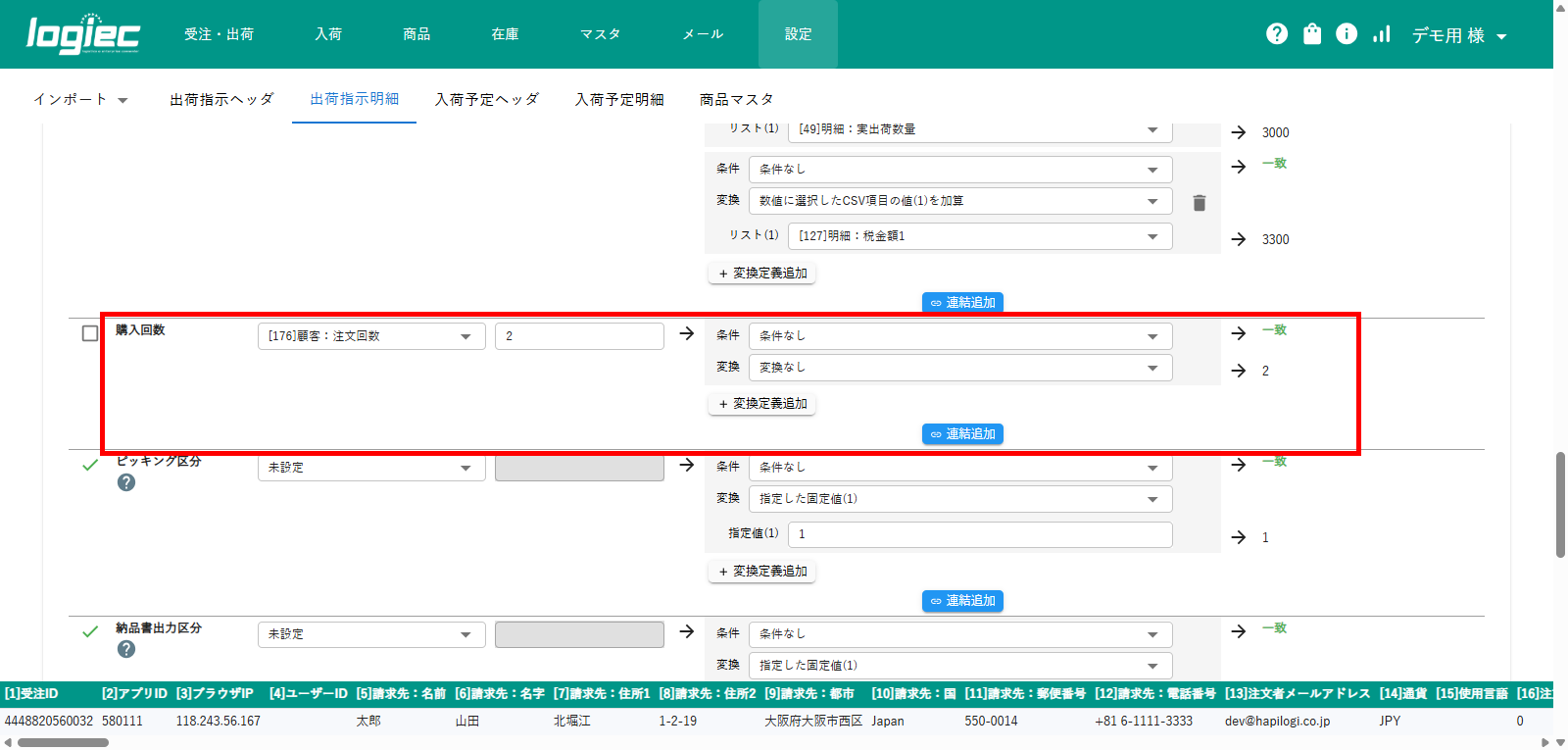 はぴロジ項目名[購入回数]にCSV項目名上「購入回数」に該当する項目が紐づいていることを確認。