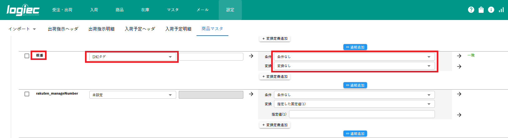 はぴロジ項目名のプルダウンより「[商品マスタ拡張]枝番」を選択し、条件・変換を以下のように設定します。