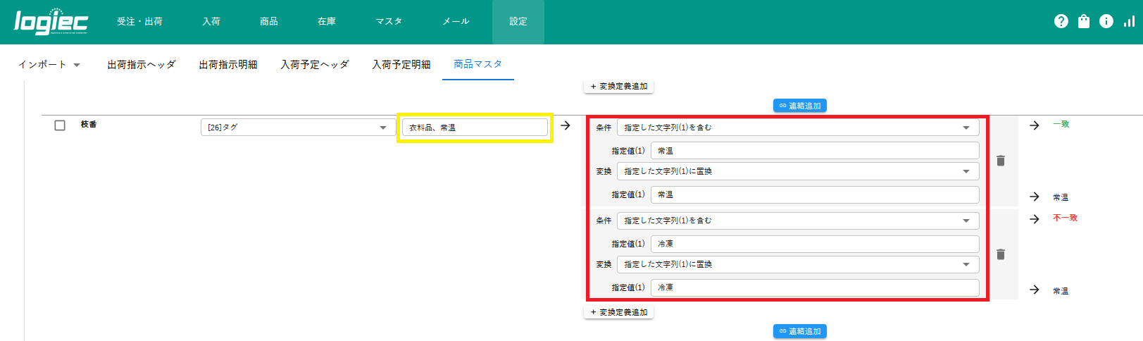 | 指定値(1) | 枝番に設定した文言を文字列完全一致で入力 例)常温 |