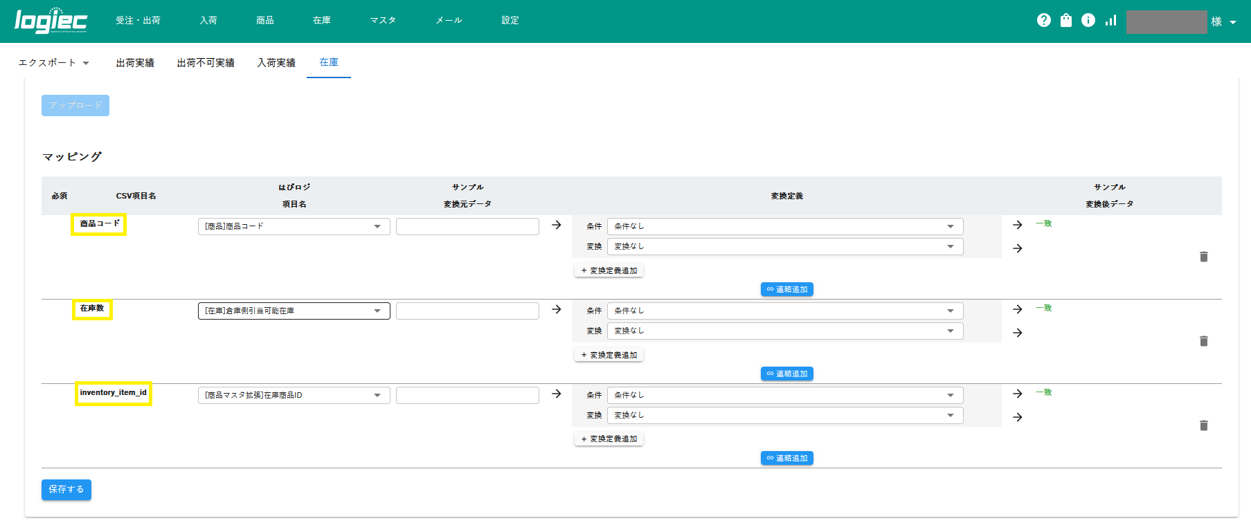 4列目がCSV項目名に追加されているので、はぴロジ項目名のプルダウンより「[在庫]倉庫名」を選択し、条件・変換を以下のように設定します。