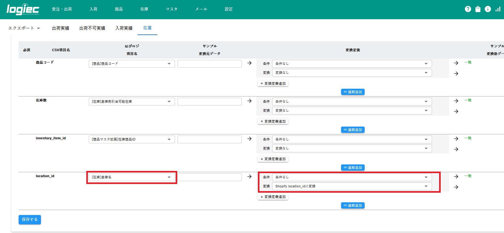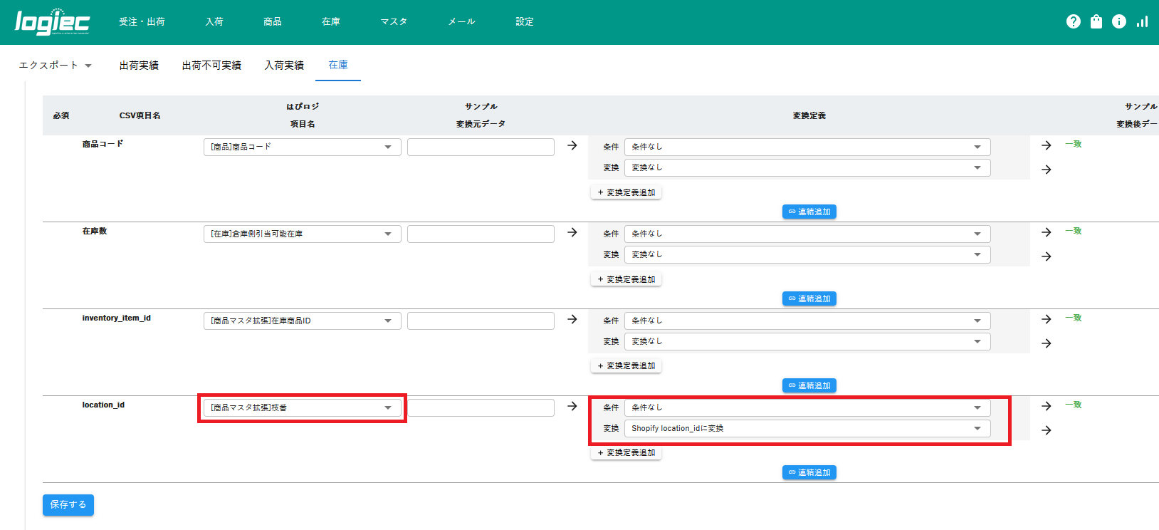 | 変換 | Shopify location_idに変換 |