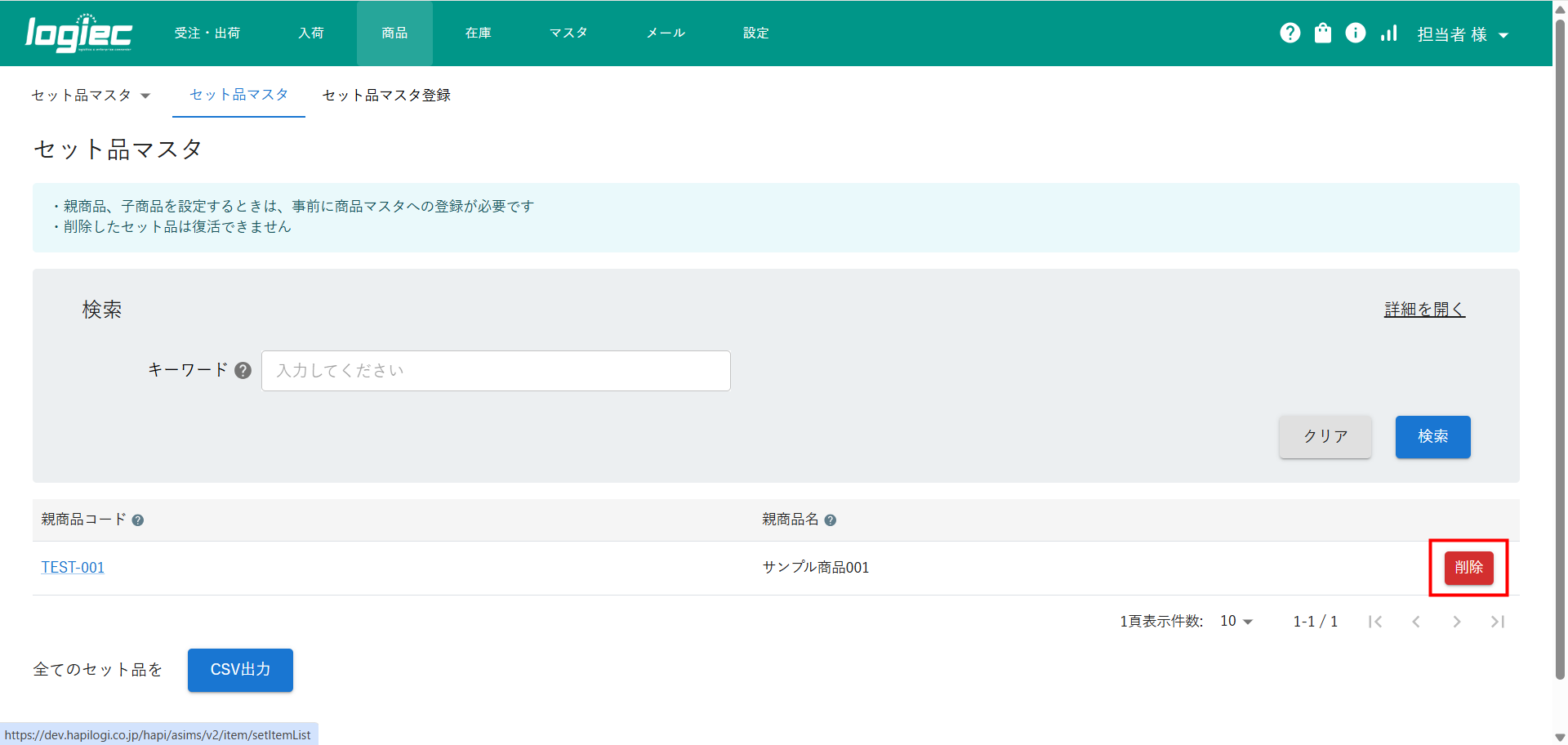 削除ボタンをクリックすると、セット品マスタの削除ができます。