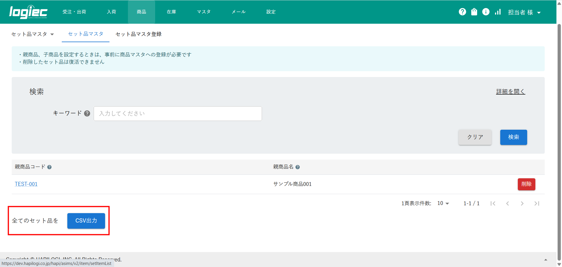 ②画面下部「CSV出力」ボタン、もしくはセット品マスタ>セット品登録>「ダウンロード」ボタンから取得できます。