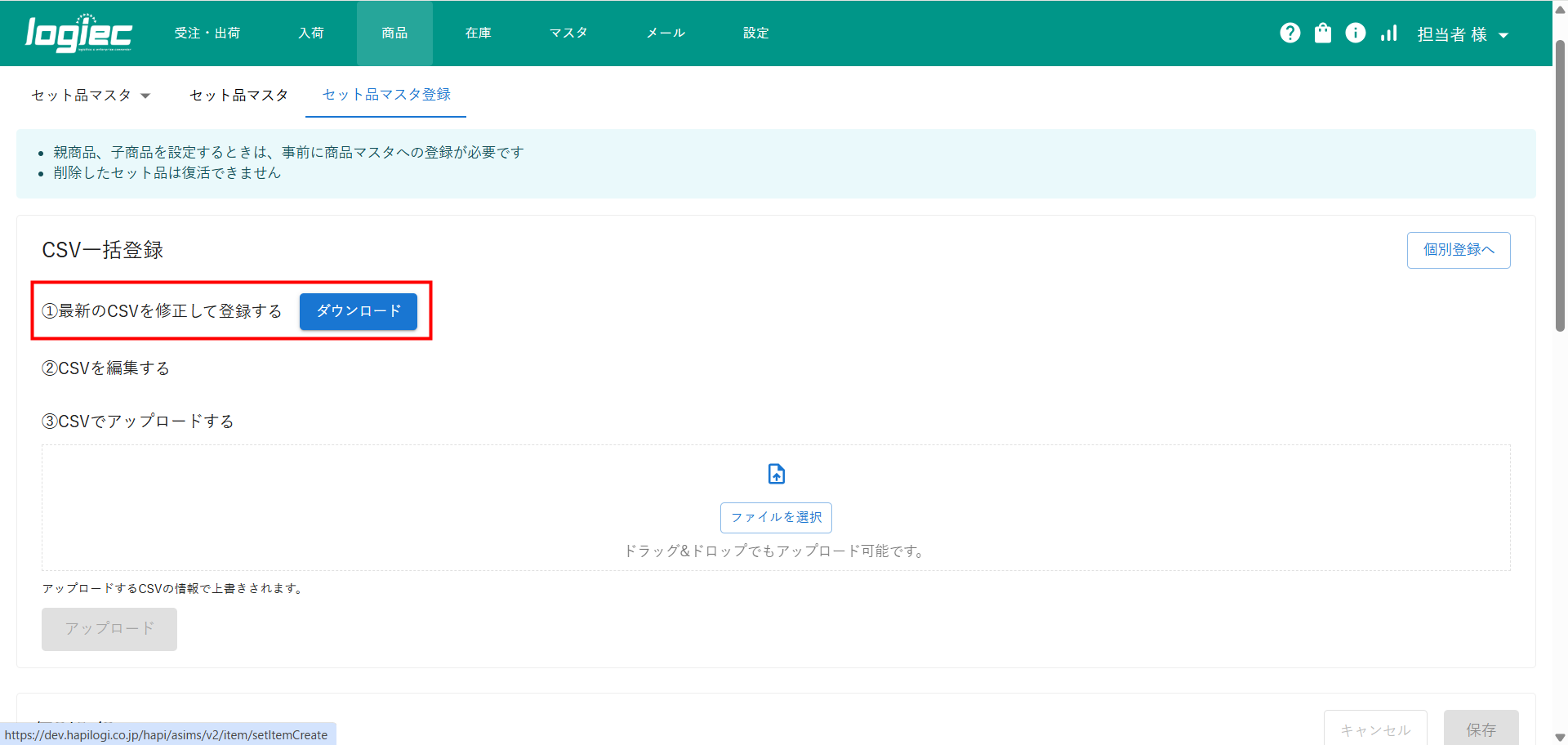 登録したセット品マスタをCSVでダウンロードする方法です。