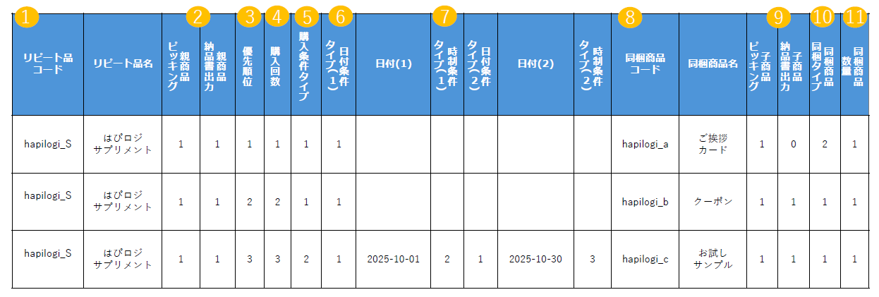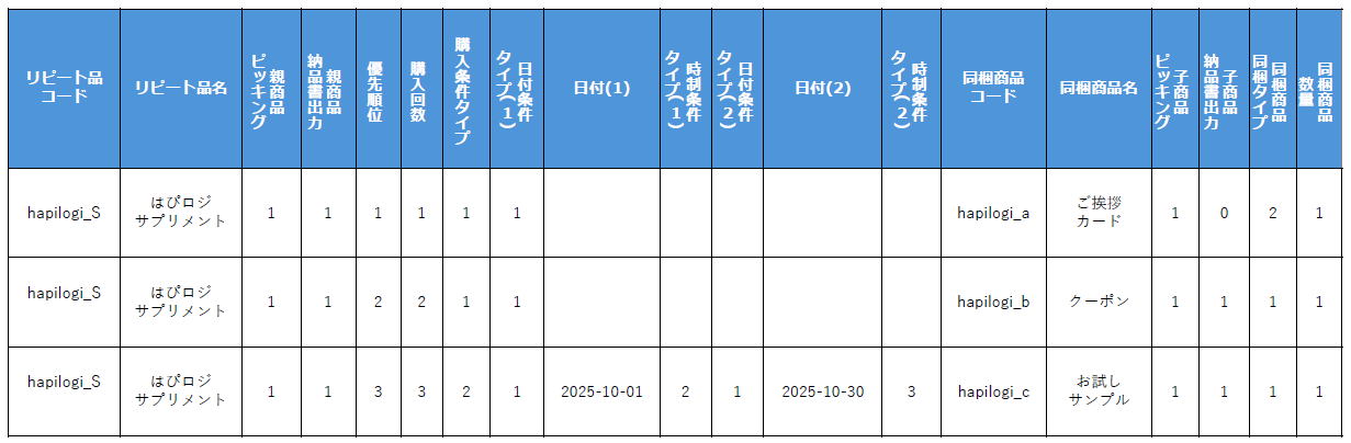下記は「はぴロジサプリメント」という商品のリピート品マスタを登録するためのCSVです。