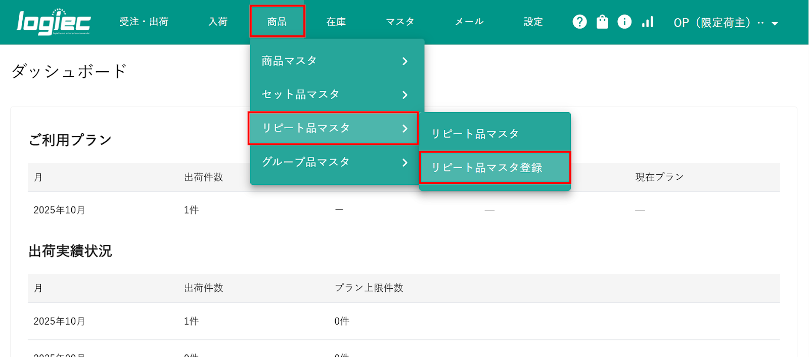 1)logiecメニューバー商品>リピート品マスタ>リピート品マスタ登録をクリックします。