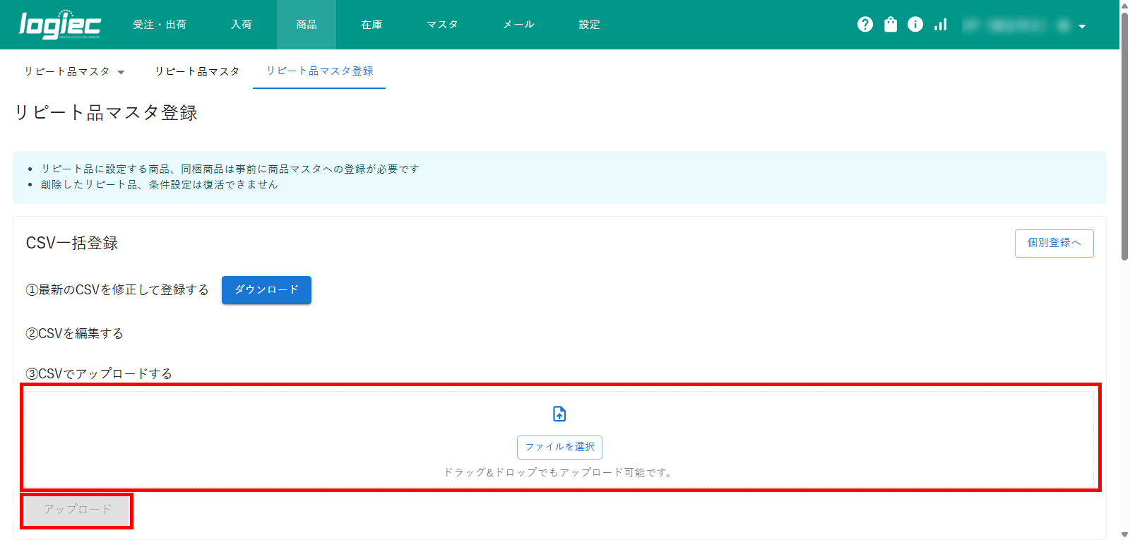 2)ファイルをドラッグ & ドロップまたはクリックして作成したリピート品マスタのCSVファイルを選択して、「アップロード」をクリックします。