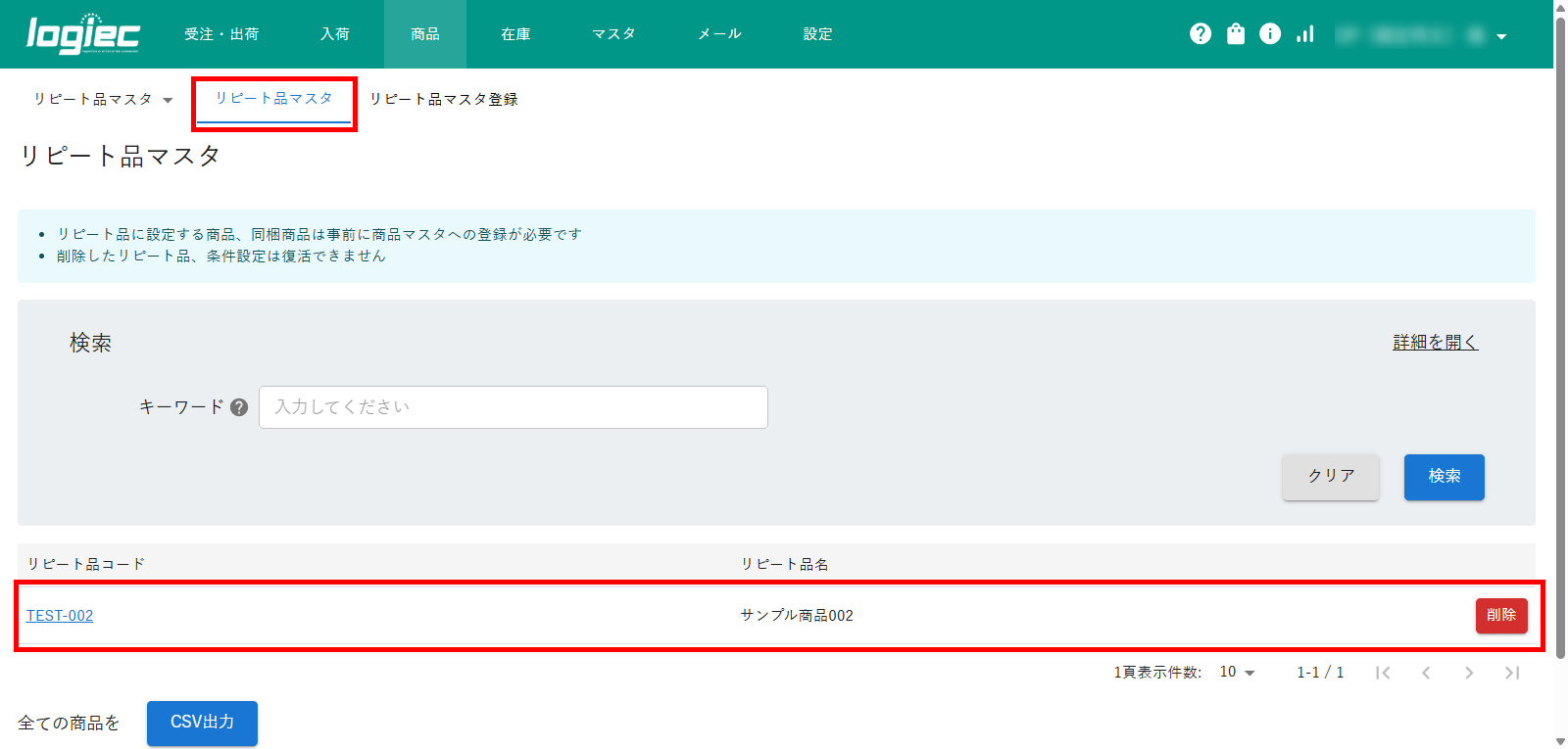 2)リピート品マスタ画面の「CSV出力」ボタンをクリックすると、登録されているリピート品マスタの一覧がCSVダウンロードされます。
