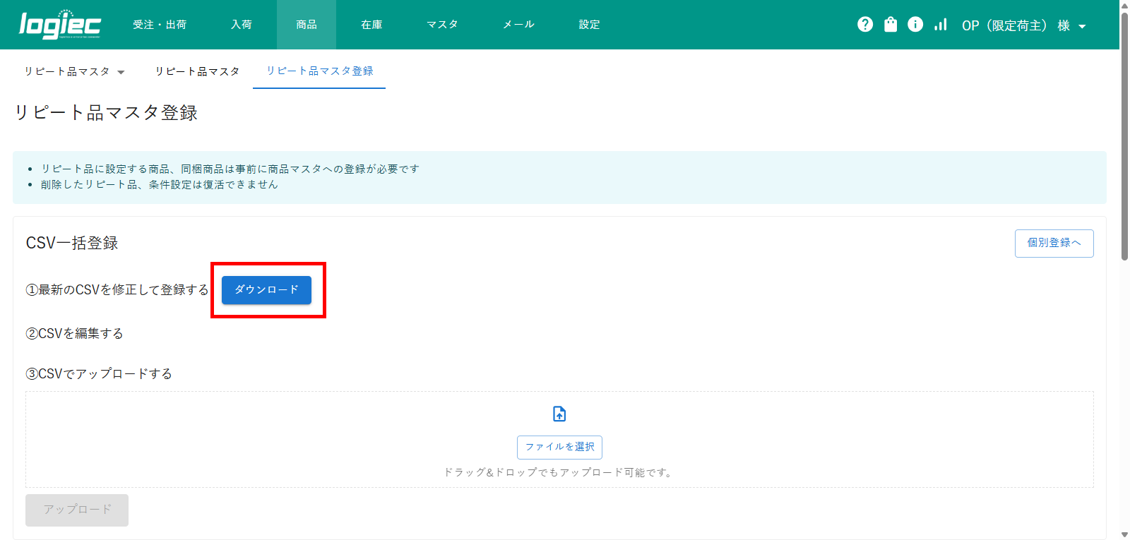 2)CSV一括登録の「ダウンロード」をクリックしてリピート品マスタCSVをダウンロードします。