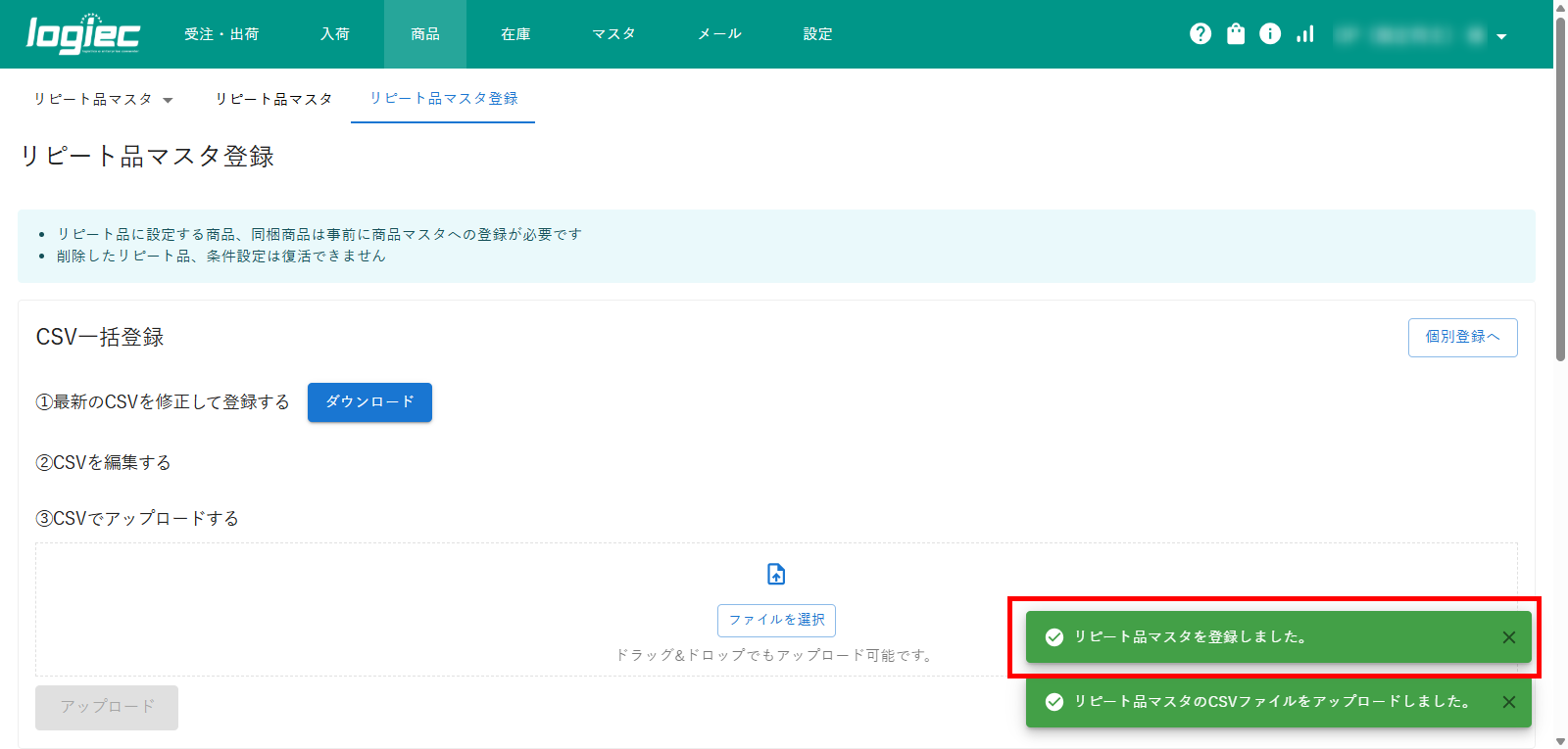 3)「リピート品マスタを登録しました」と表示されればアップロード完了です。