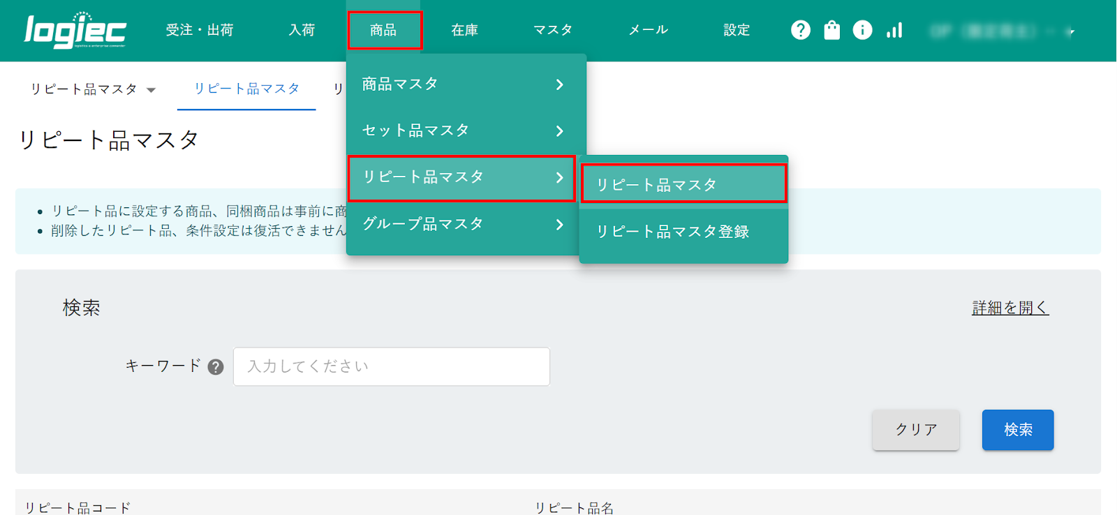 1)logiecメニューバー商品>リピート品マスタ>リピート品マスタをクリックします。