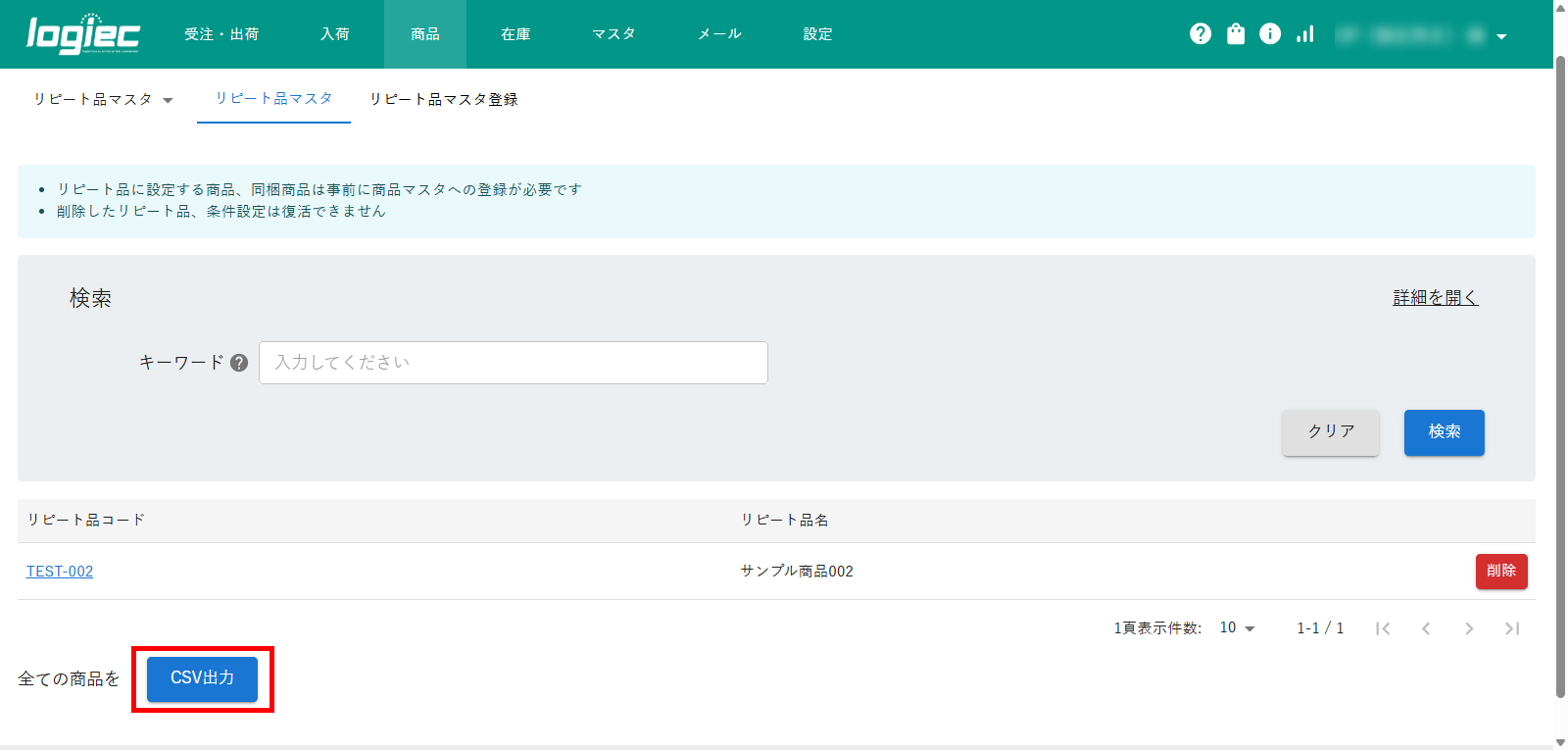 登録したリピート品マスタをCSVでダウンロードする方法です。