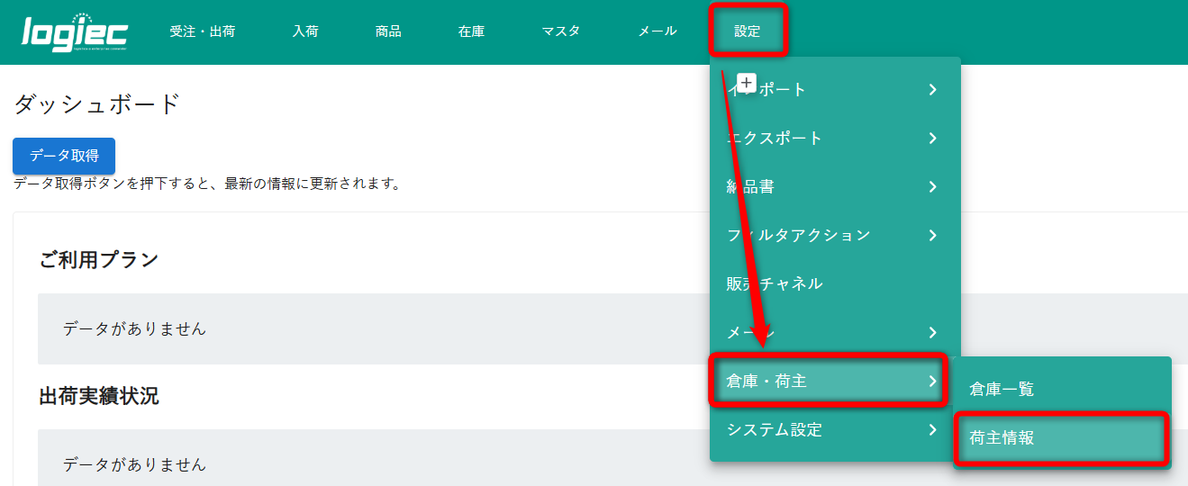 ①「設定」から「倉庫・荷主」内の「荷主情報」をクリックします。