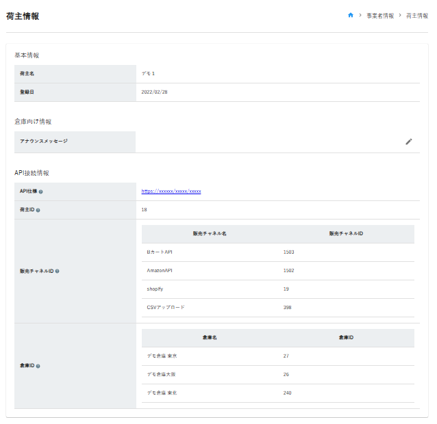 ・「荷主情報」では、現在登録されている情報の確認、倉庫向けの「アナウンスメッセージ」の登録ができます。