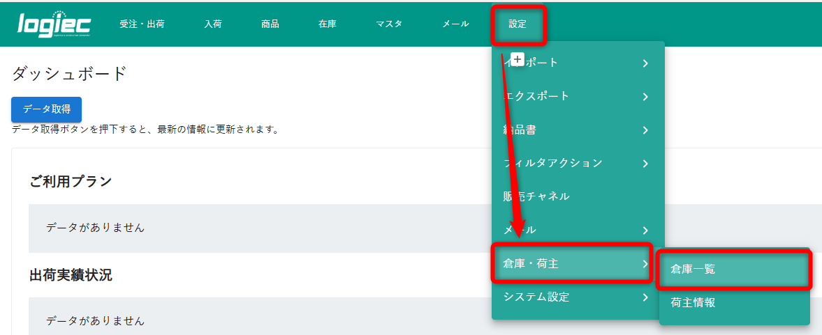 ①「設定」から「倉庫・荷主」内の「倉庫一覧」をクリックします。