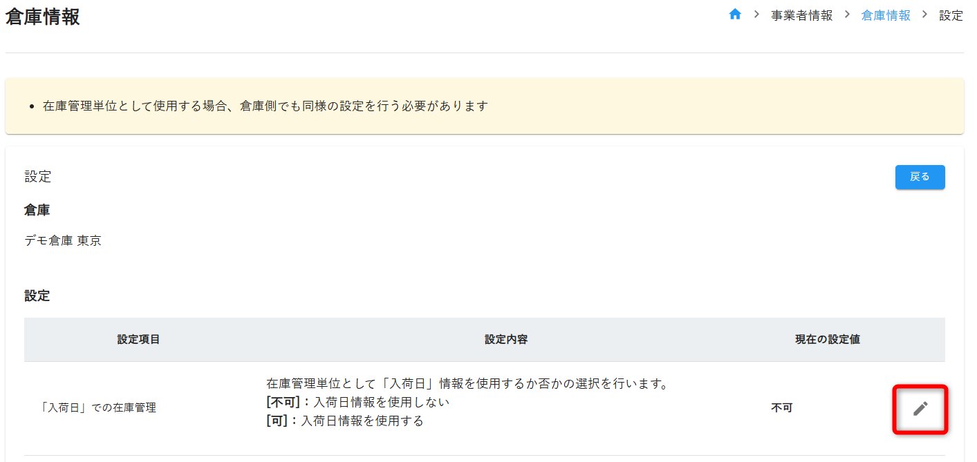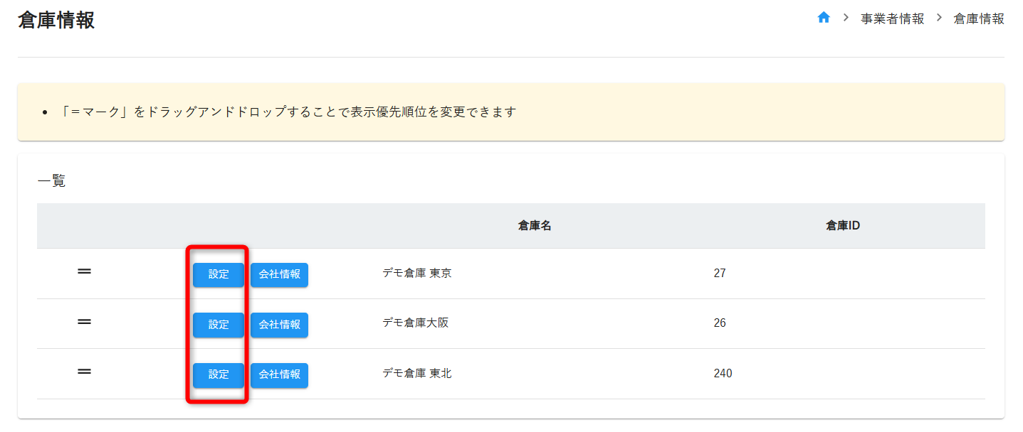 ②「設定」をクリックし、各倉庫毎に設定を変更いただけます。