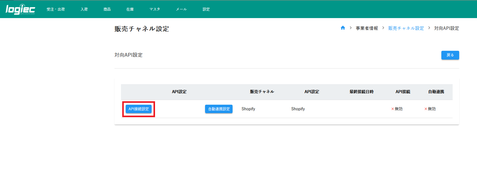 ②Shopifyチャネルの【対向API設定】をクリック。