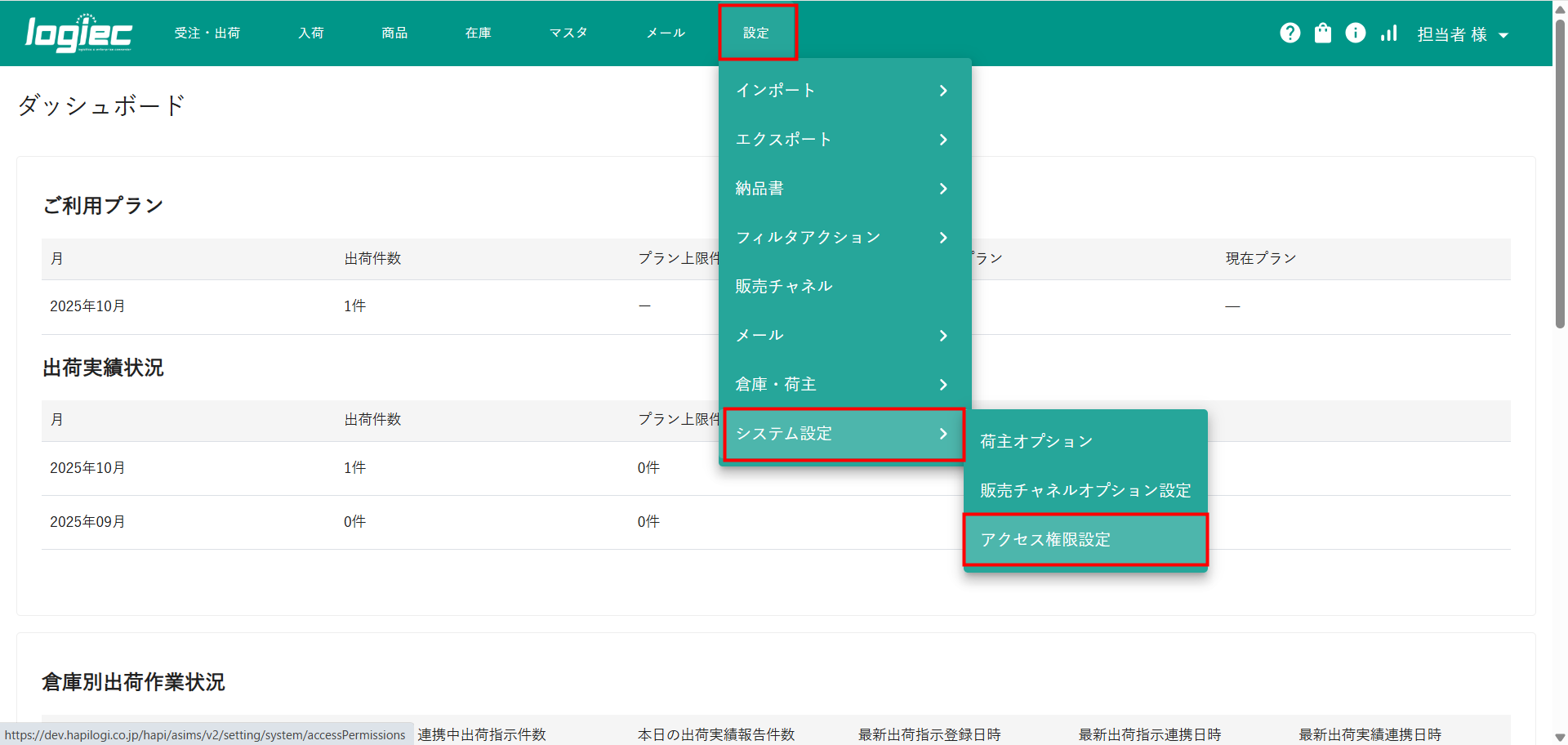 ①logiecメニューより設定>システム設定>アクセス権限設定を開きます。