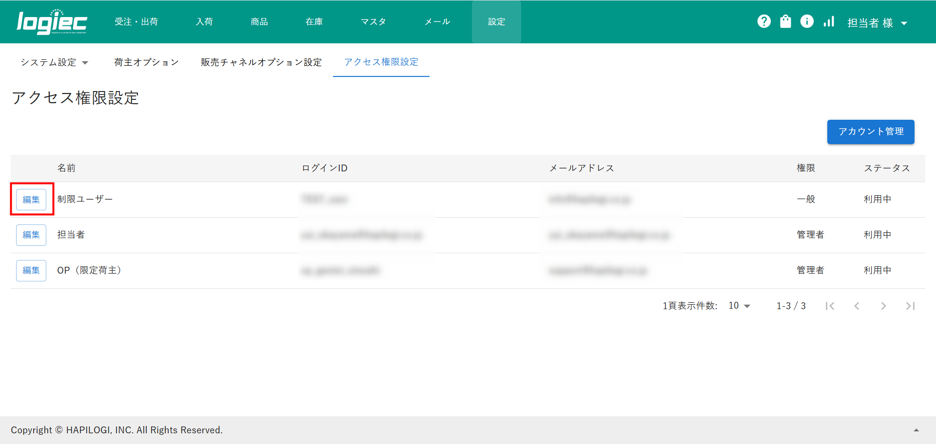 ②アクセス権限設定画面が開きますので権限を制限したいユーザーの「編集」をクリックします。