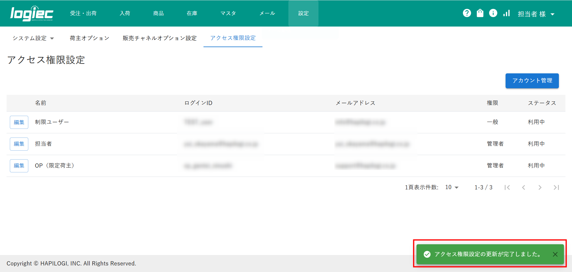 ④「アクセス権限設定の更新が完了しました。」が表示されたら更新完了です。