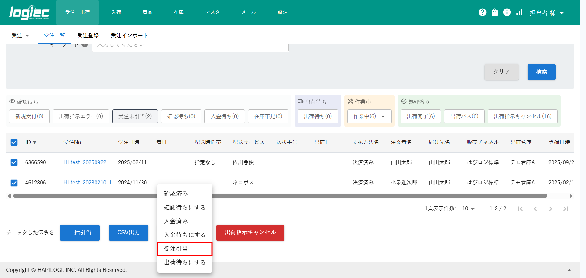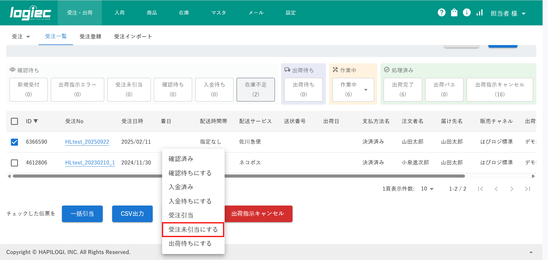 減算処理の完了連絡を受け取った後、手順1で解除した受注データを再度選択し、「受注引当」を行ってください。