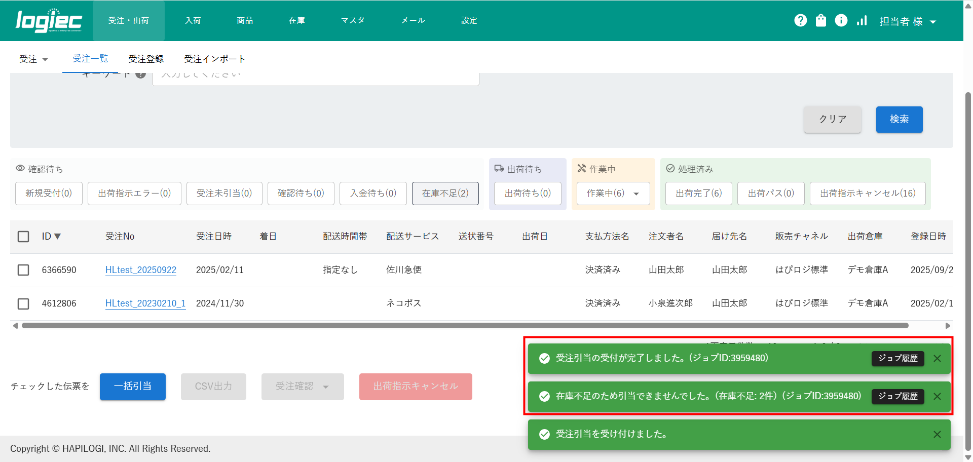 在庫数が減っているため、システム上で「在庫不足」もしくは「出荷待ち」(部分引当等の場合)となります。これにて処理は完了です。