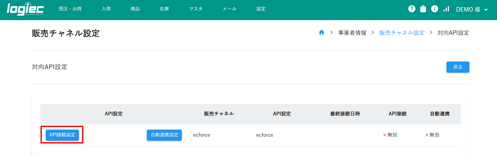 ①logiec側にログインし「設定」→「販売チャネル」→「対向API設定」→「API接続設定」に進みます。
