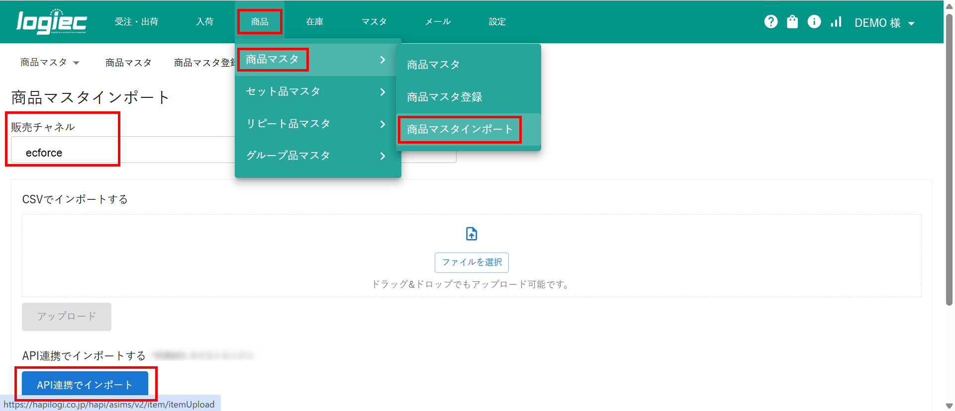 「商品」→「商品マスタインポート」→販売チャネル「ecforce」を選択→「API連携でインポート」ボタンをクリック