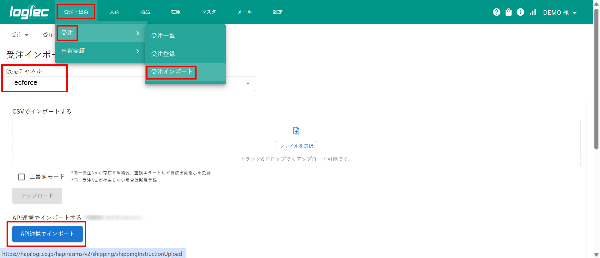 ・「受注・出荷」→「受注インポート」→販売チャネル「ecforce」を選択