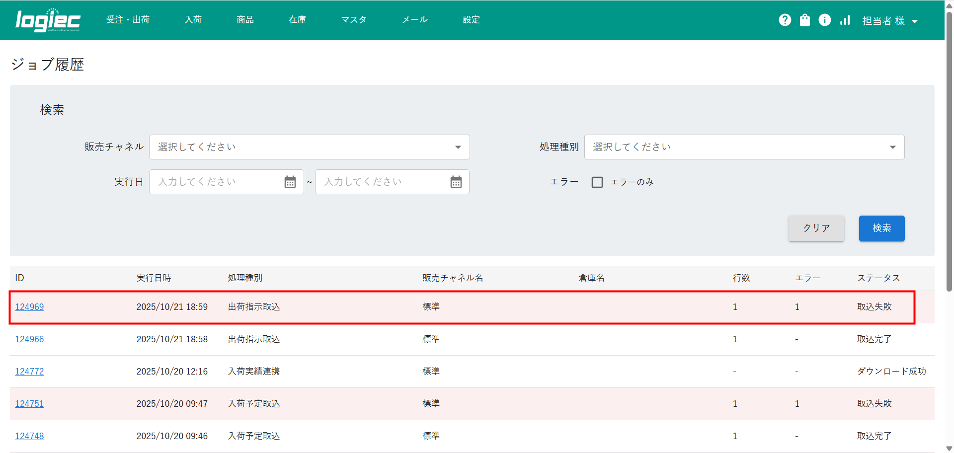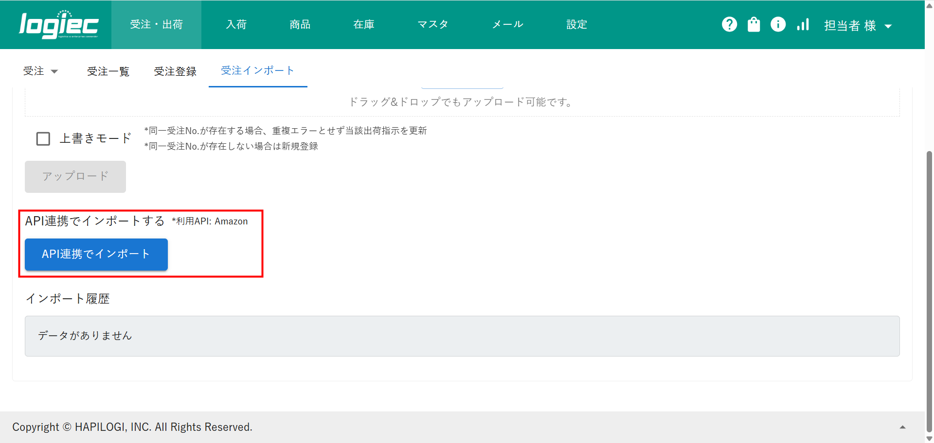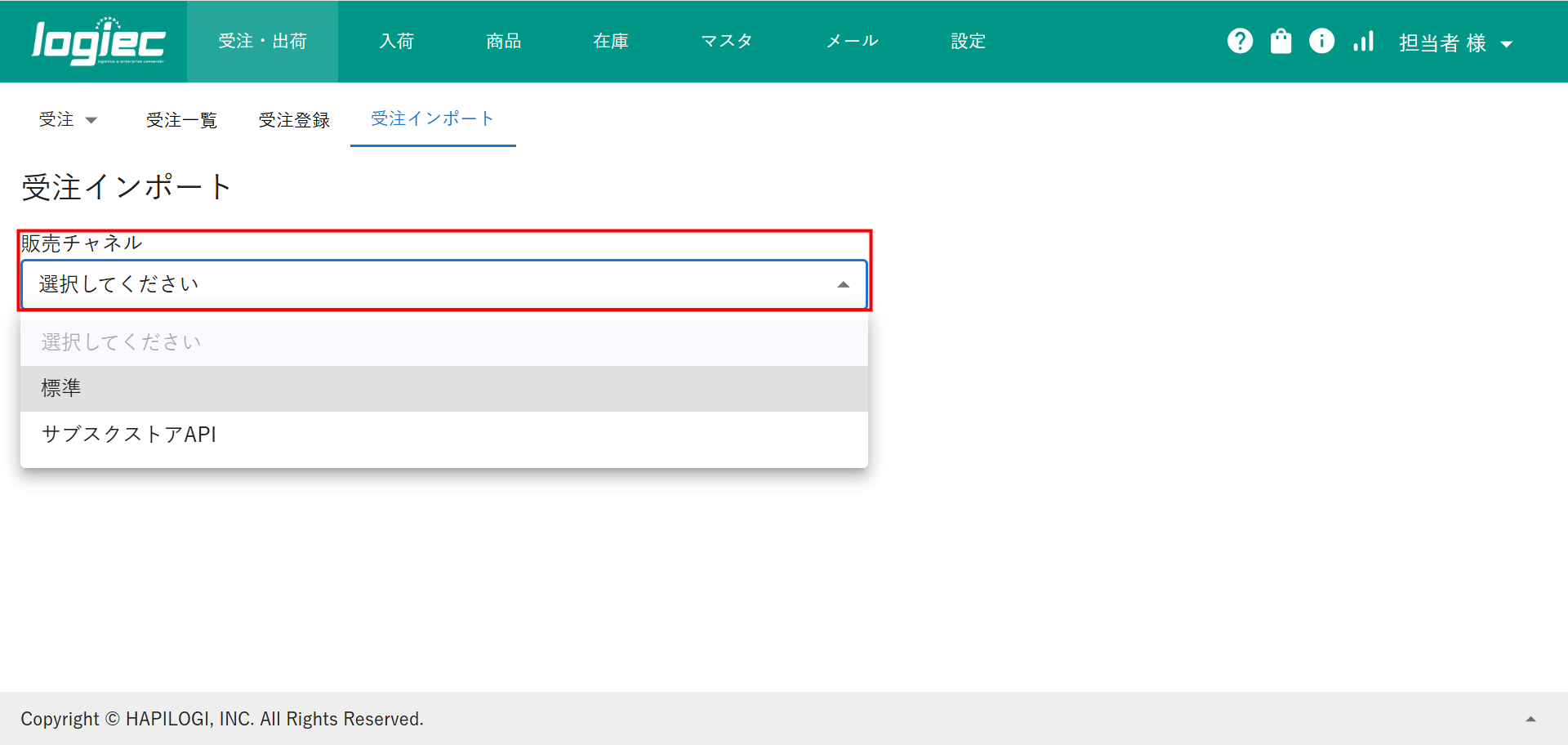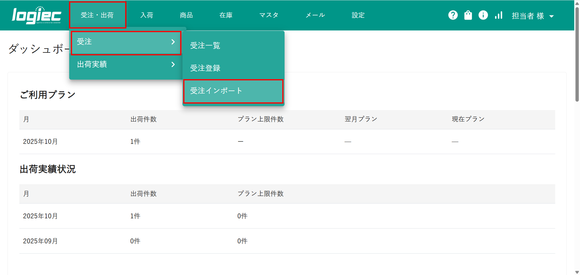 ①logiecメニューバーより受注・出荷>受注>受注インポートを選択し、クリックします。