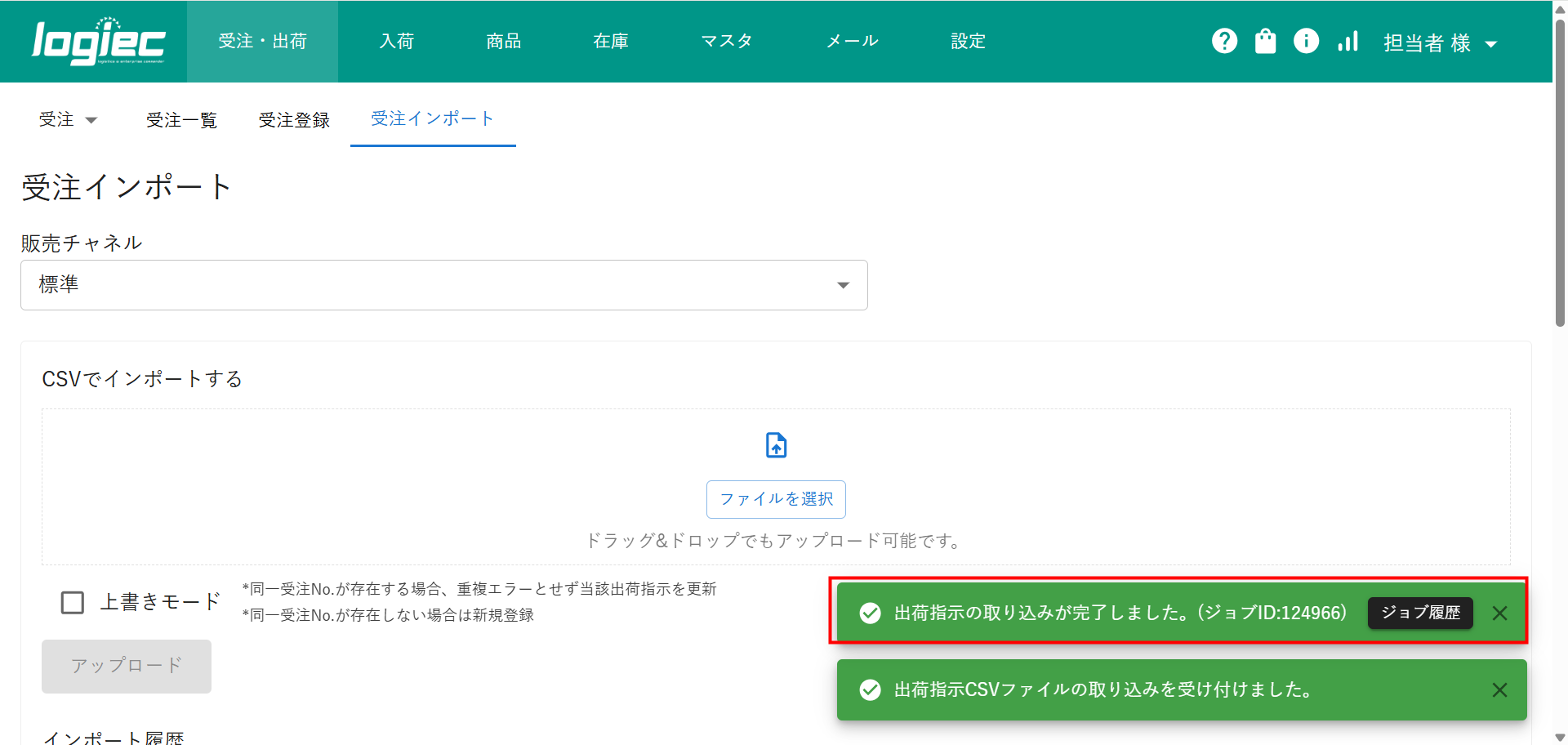 ④画面右下に緑色の通知バーに”出荷指示の取り込みが完了しました”と表示されましたらアップロード完了です。