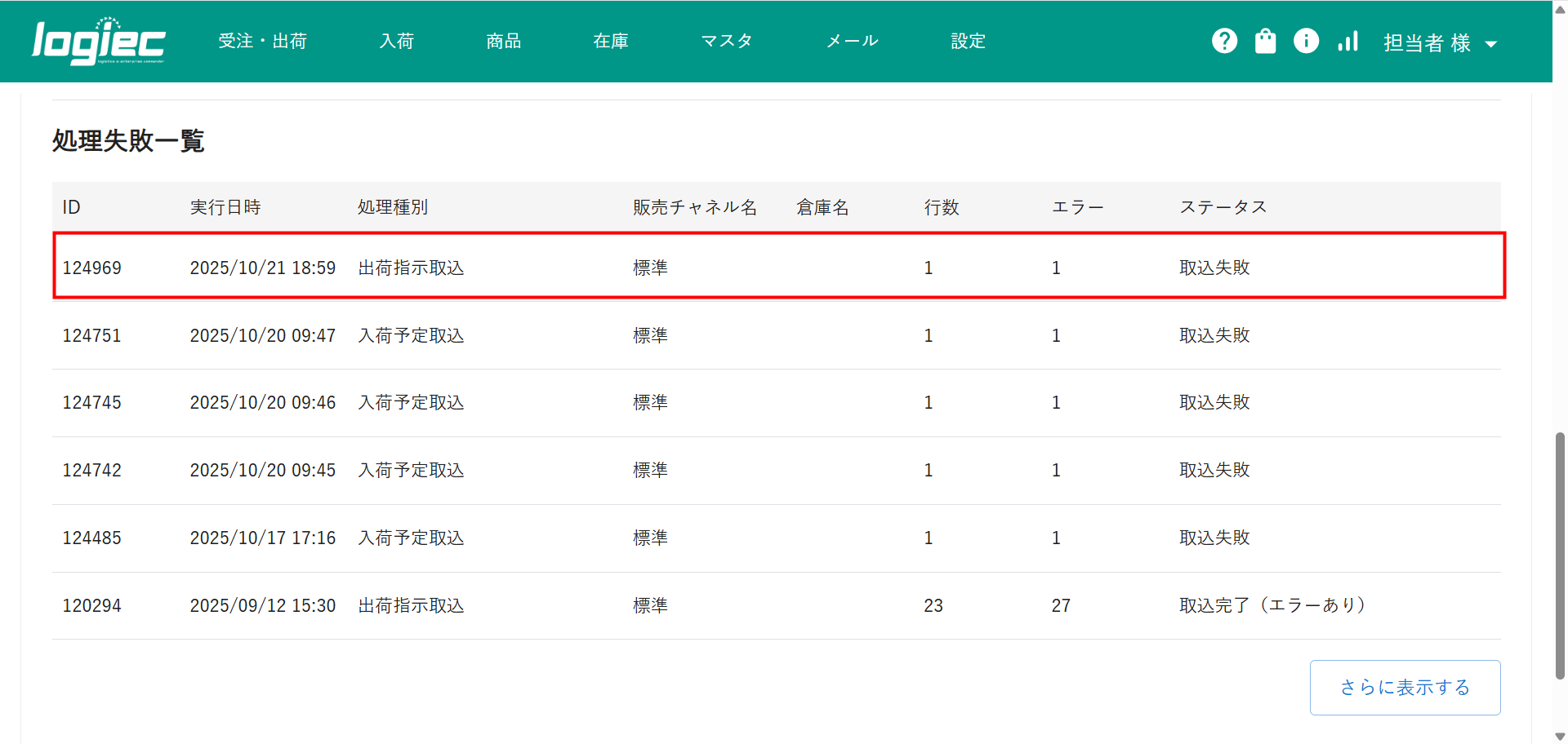 ①エラーがあった場合、右下に赤色の通知バーが表示されます。また、ダッシュボード画面下の「処理失敗一覧」にも表示されます。