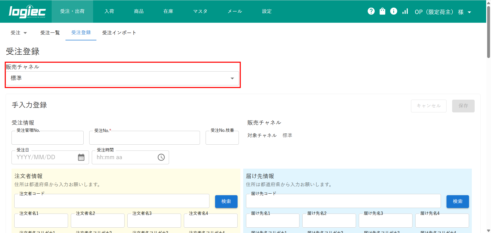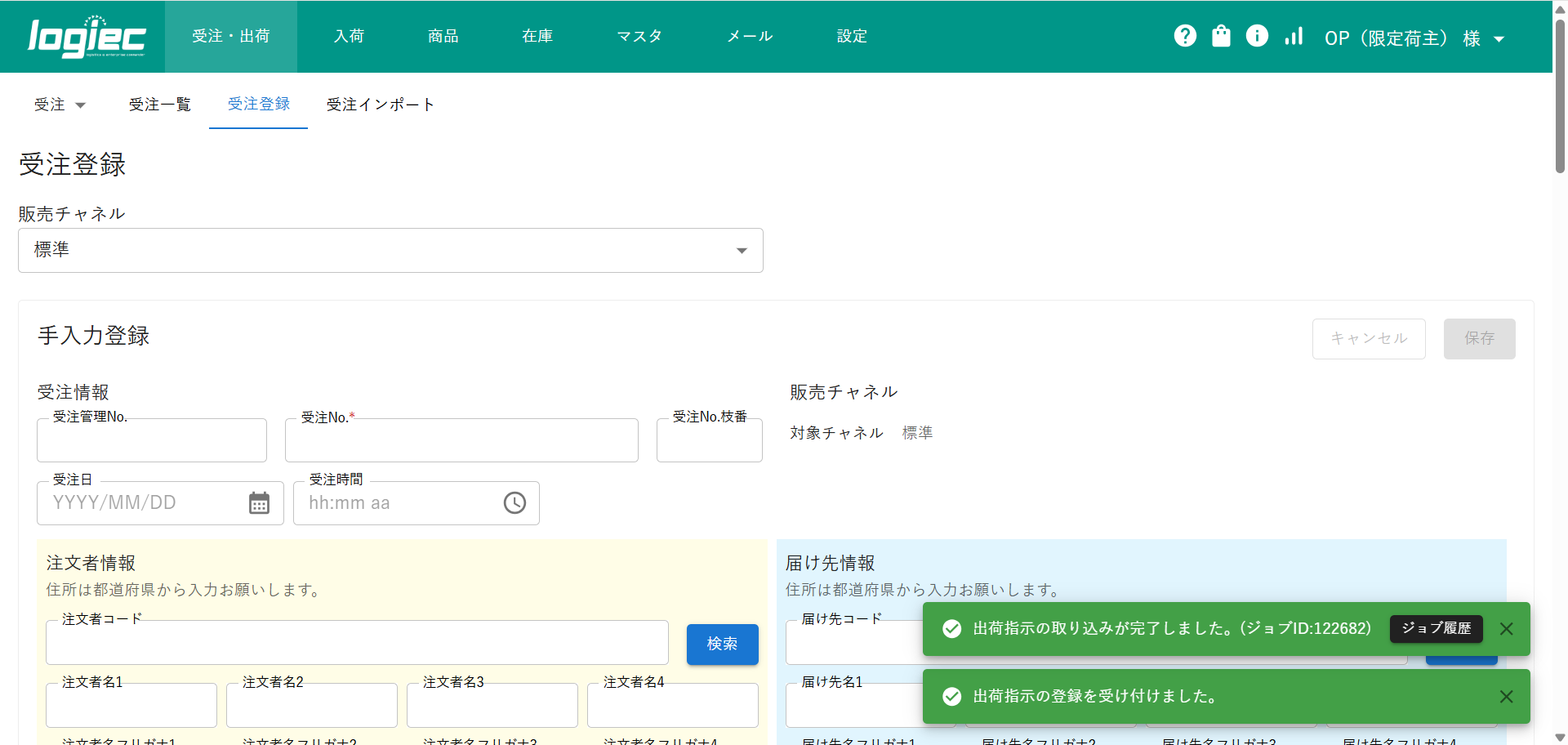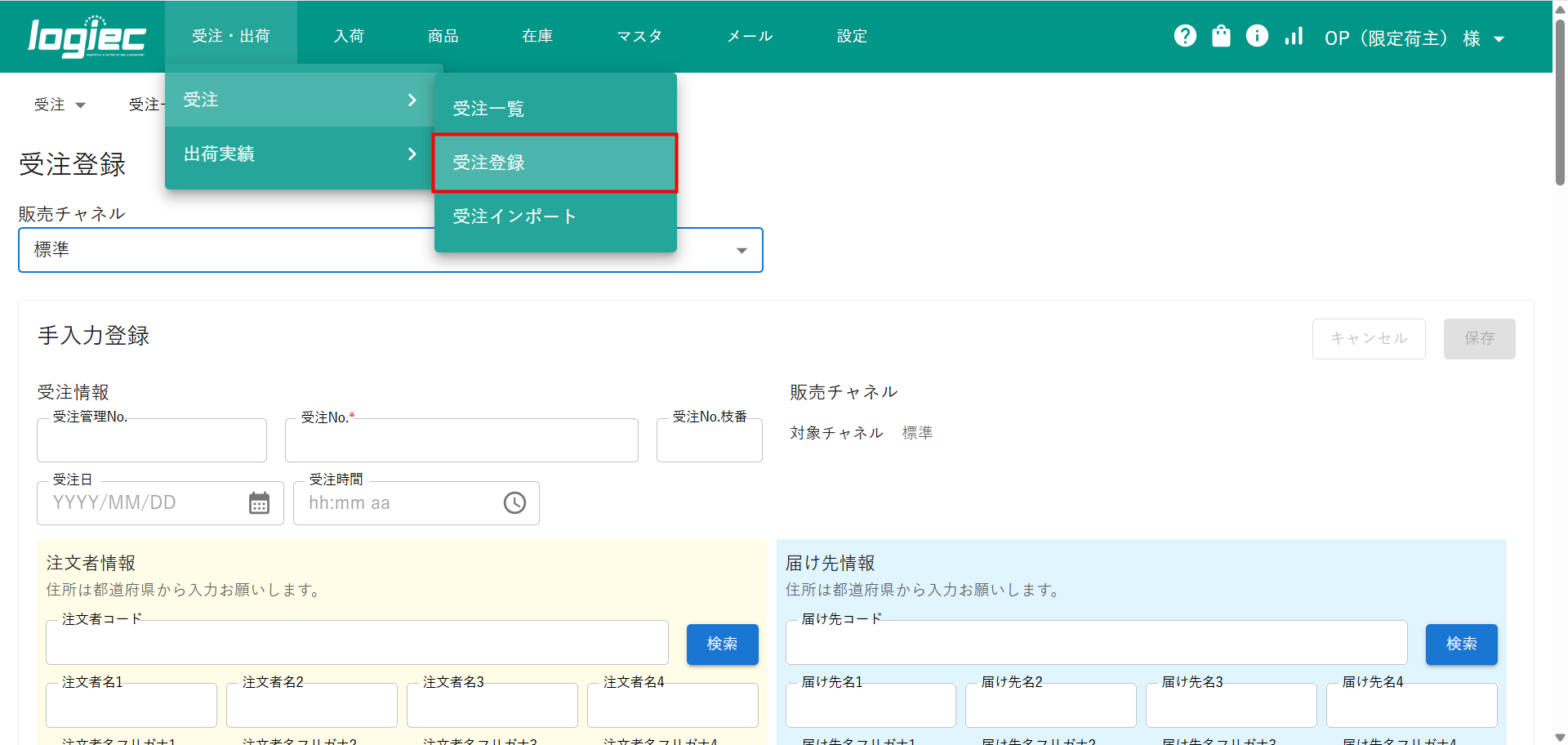 1)logiecメニューバー「受注・出荷」の「受注」をクリックし、「受注登録」の画面を開きます。