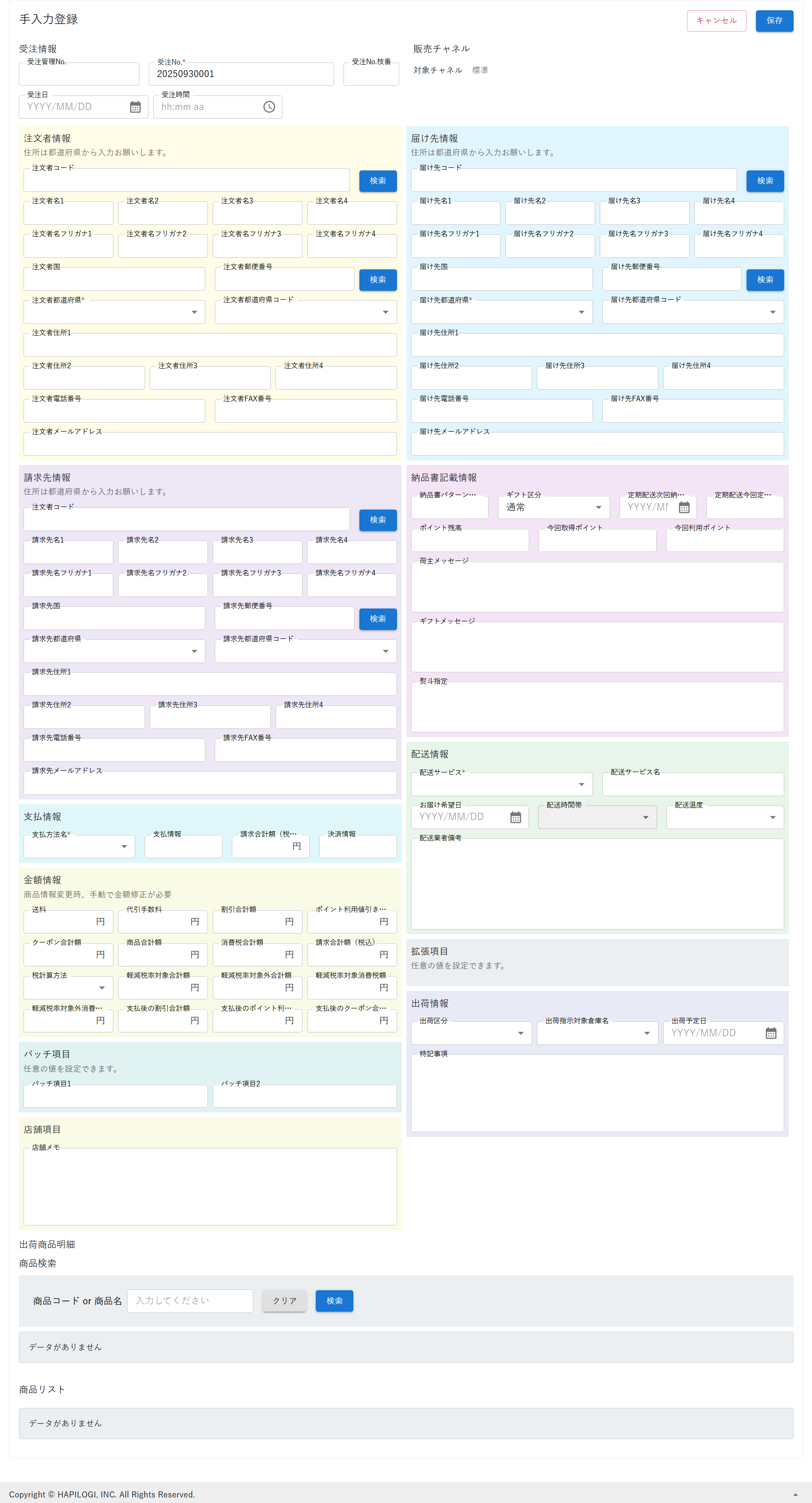 POINT:必要項目はご依頼いただいた設定内容により異なります。 また、CSVアップロードやAPI連携時に自動で入力される項目を設定している場合、手入力では反映しない場合があります。 弊社にご依頼いただいた設定内容が手入力時に反映されていない場合、サポートチームまでお問い合わせください。 お問い合わせフォームはこちら |