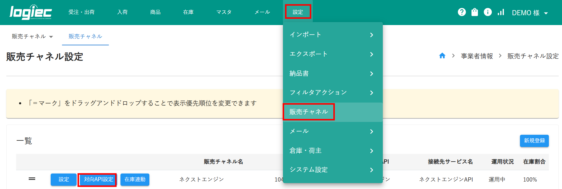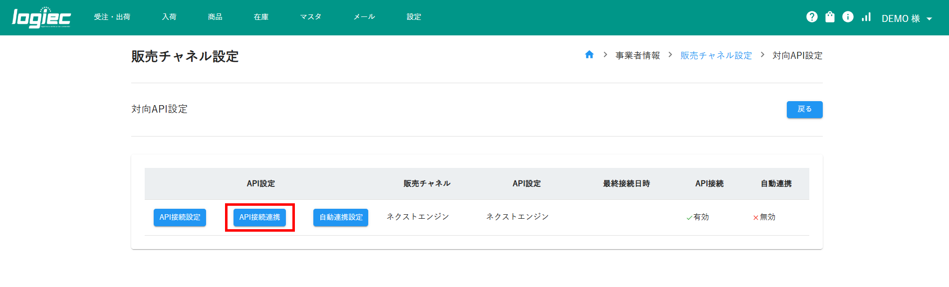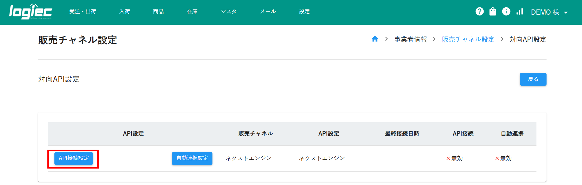 ①logiec側にログインし「設定」→「販売チャネル」→「対向API設定」→「API接続設定」に進みます。